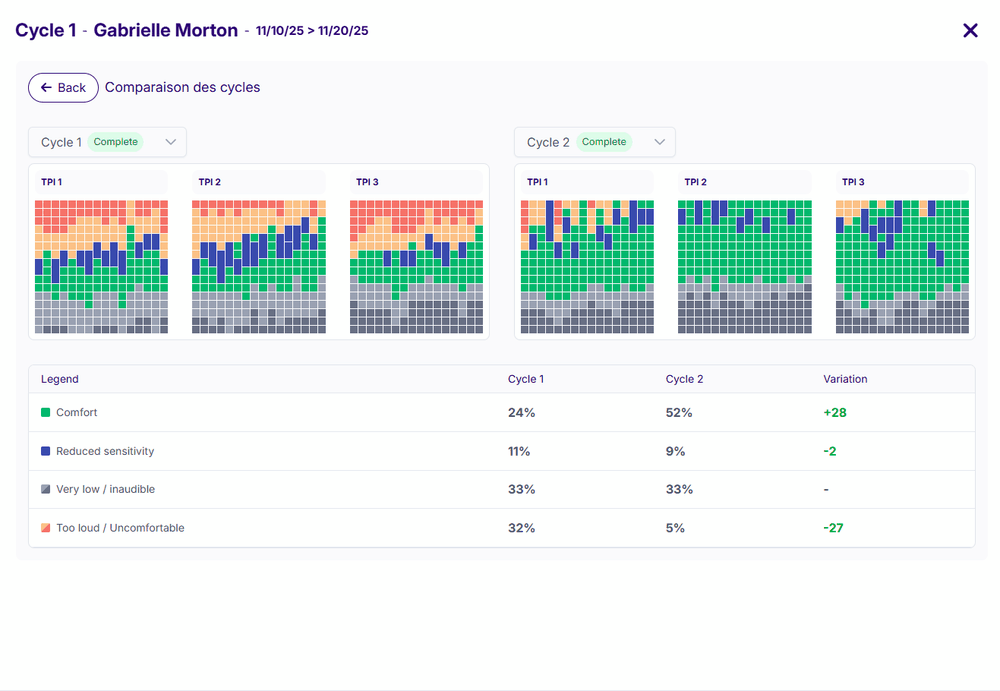 Beyond the few indicators mentioned here, this article delves more deeply into the hearing aid adjustments and the statistical improvement of the scores between the two cycles, as well as the information relating to the PREMs and PROMs questionnaires.