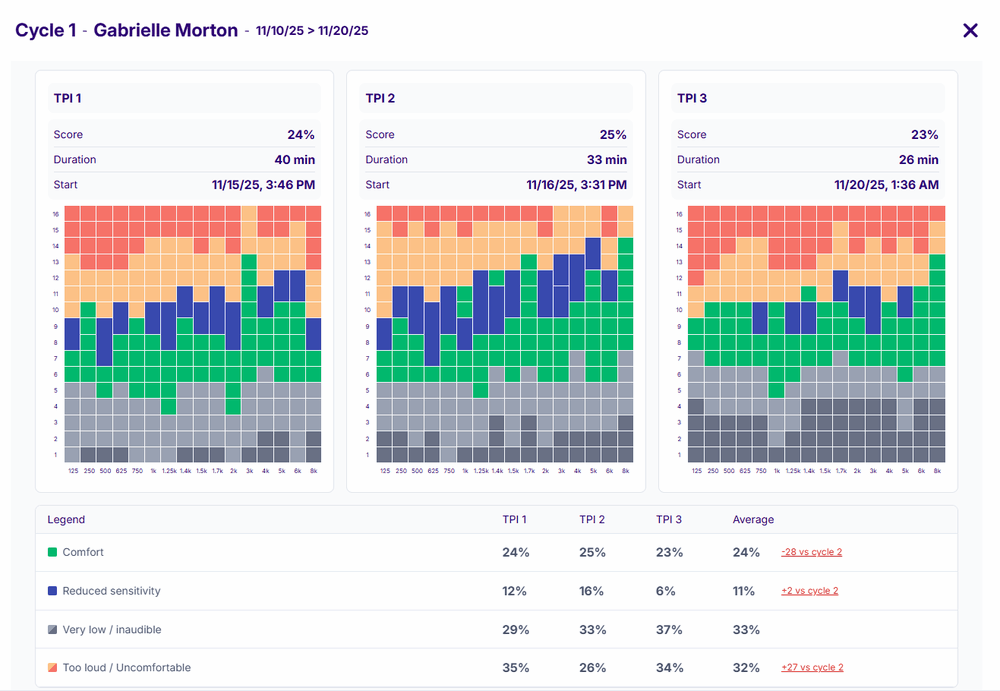 Administered in a cycle of three tests, it provides a personalized baseline of the patient by creating their Dynamic Audio Profile (DAP).